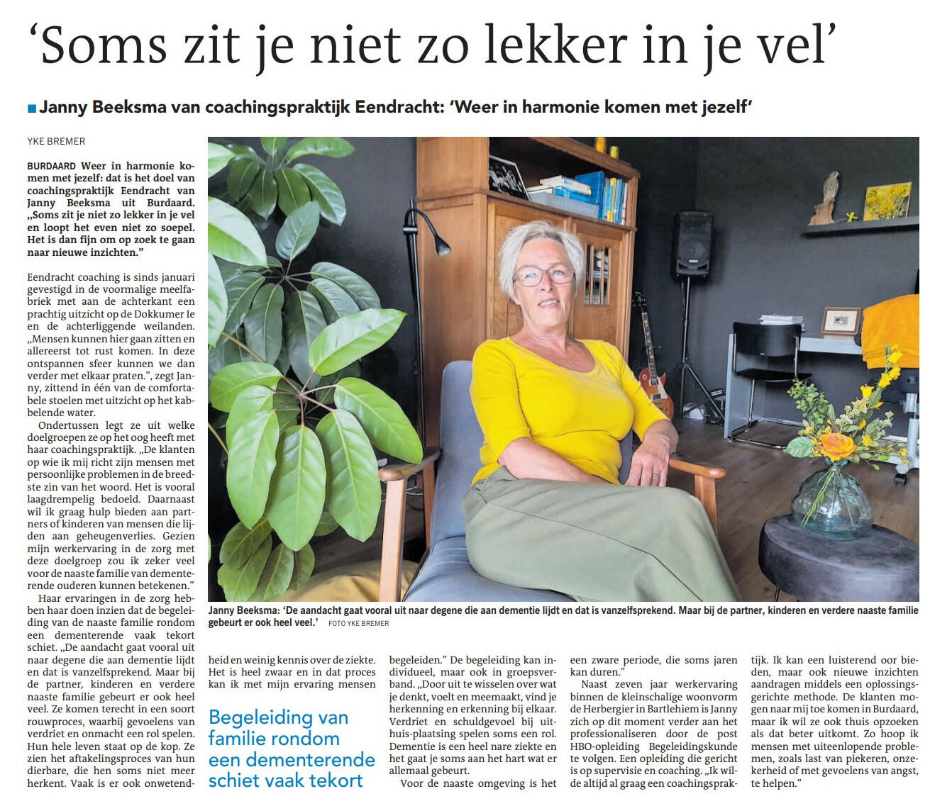 Mijn naam is Janny Beeksma. Mijn coachingspraktijk bevindt zich in de voormalige meelfabriek ‘De Eendracht’, op een prachtige plek aan de Dokkumer Ee in Burdaard.Mijn drijfveer als supervisor en coach is het versterken van veerkracht en dat je weer eigen regie krijgt over je leven. Mensen geven mij vaak mee dat ik rust uitstraal, verder ben ik toegankelijk, direct en ik hou van humor. Gelijkwaardig, betrokken, eerlijk en open zijn mijn kernwaarden.Verbinding en groei lopen als een rode draad door mijn leven. Verbinding betekent voor mij contact tussen mensen, elkaar zien, horen en voelen. Verbinding geeft vertrouwen en maakt ruimte voor openheid.Wanneer mensen in beweging komen, leren en veranderen, maakt mijn hart een ‘sprongetje’. Ik ervaar veel voldoening wanneer mensen leren van ervaringen en leren van elkaar. Voor mij staat de mens en de vraag centraal. Ik begeleid graag intuïtief en in het hier en nu. Wanneer de vraag duidelijk is bekijken we welk traject hier het best bij pastIk heb een warme persoonlijkheid, ben inlevend, nuchter, toegankelijk en ik hou van humor. Want lichtheid is waar we naar op zoek gaan.